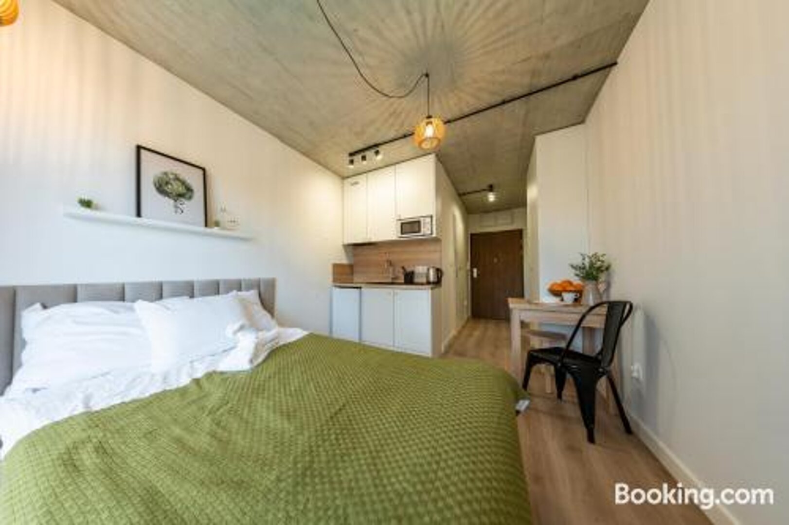 Dwuosobowy wygodny i funkcjonalny pokój z łazienką, aneksem kuchennym i balkonem. Lokal wyposażony jest we wszystkie niezbędne sprzęty agd (płyta grzewcza, czajnik, kuchenka mikrofalowa, lodówka), przybory kuchenne, żelazko, suszarkę do włosów, ręczniki, szlafroki. Pralnia znajduje się na poziomie hali grażowej.